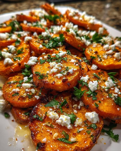 Roasted Sweet Potato Rounds with Honey & Feta – Caramelized sweet potato slices roasted to perfection, drizzled with golden honey, and topped with crumbled feta and fresh parsley. A sweet and savory side dish everyone will love!