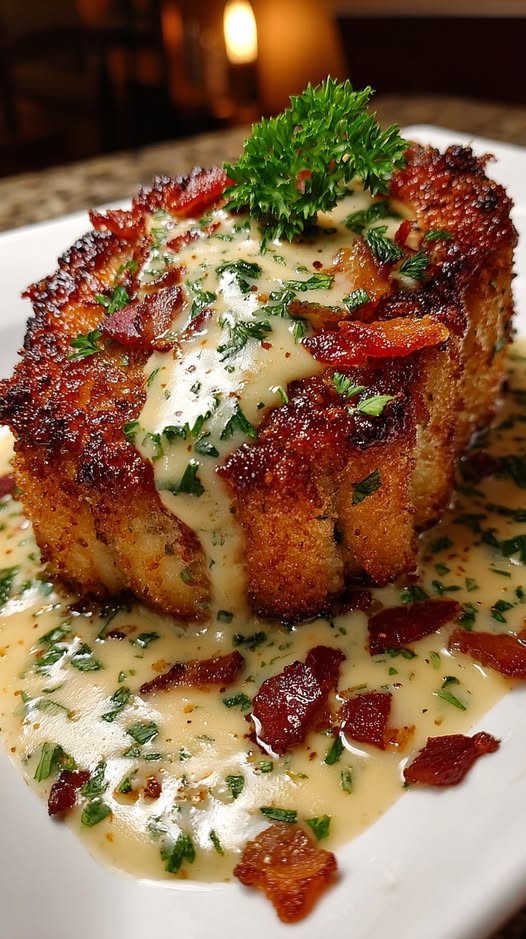 Crispy, golden-fried chops topped with creamy turkey bacon gravy — the ultimate comfort meal for a cozy night in!