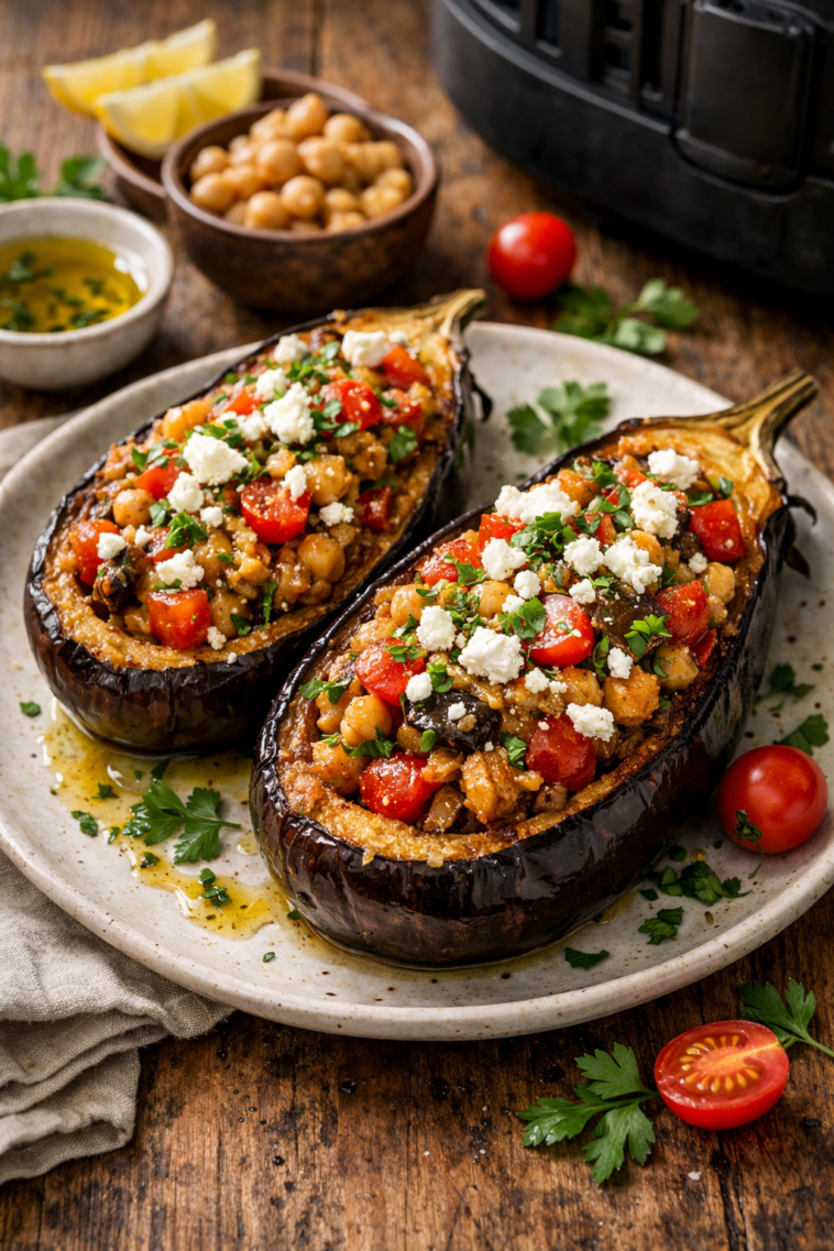 Mediterranean Stuffed Eggplant in the air fryer is a flavorful, wholesome dish made with tender roasted eggplant filled with a savory mixture of vegetables, herbs, and protein.