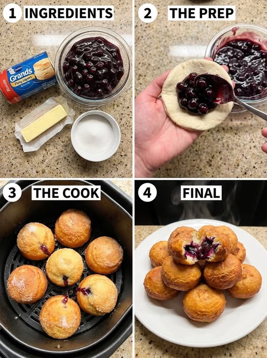 Made with fluffy biscuit dough, buttery sugar coating, and juicy blueberry pie filling, these little treats cook perfectly in the air fryer.