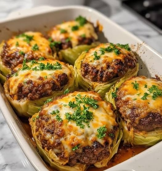 Air Fryer Cabbage Burgers are juicy, cheesy, and packed with rich beef flavor wrapped in tender cabbage leaves.